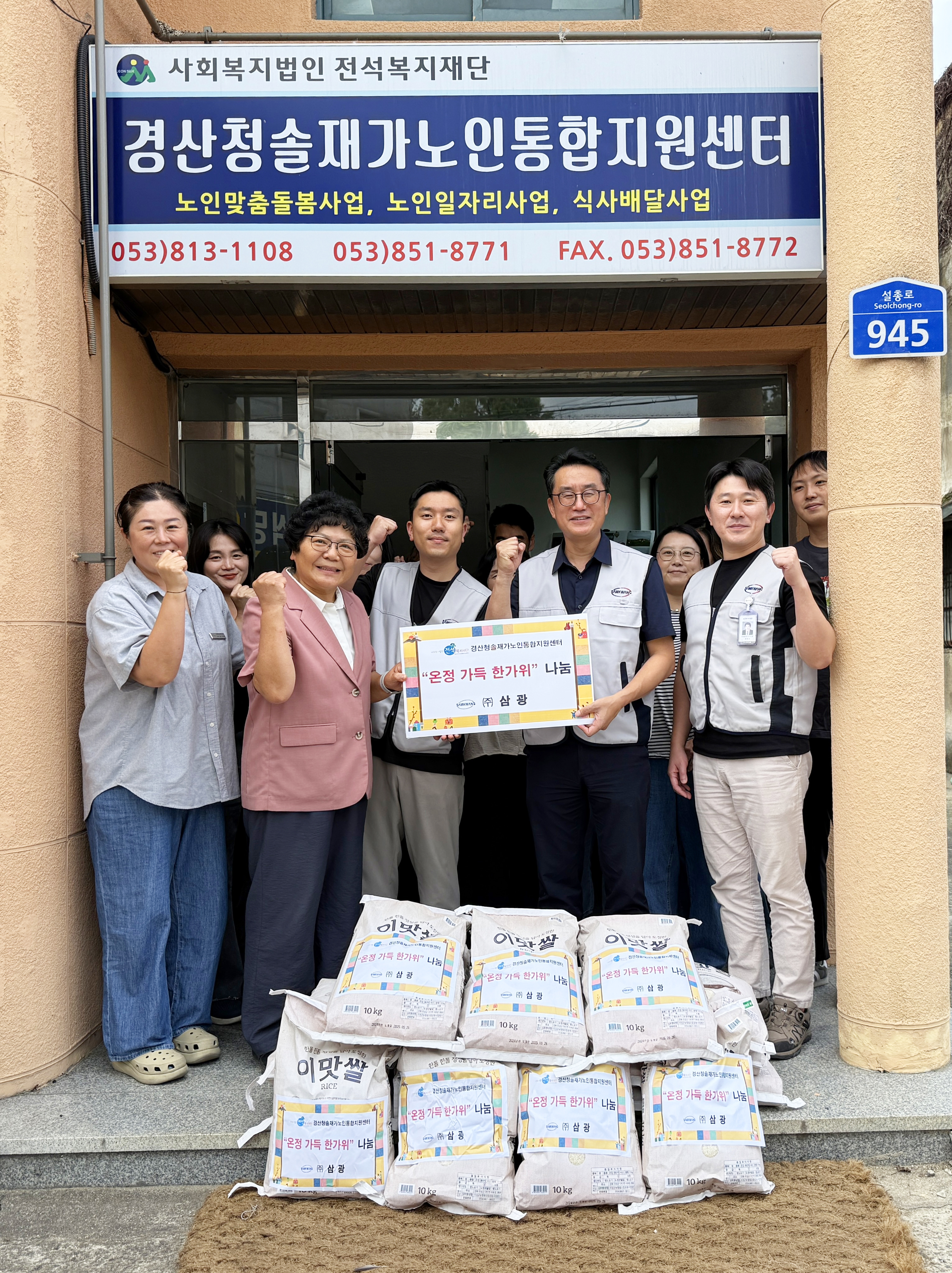[2025년 9월 30일(화)] ㈜삼광 Global 인사총무지원팀 직원들이 추석 명절을 맞아 청솔노인복지회관을 방문해 어려움을 겪는 지역 어르신들에게 쌀과 생활지원금을 직접 전달하며 따뜻한 나눔 활동을 펼쳤다.