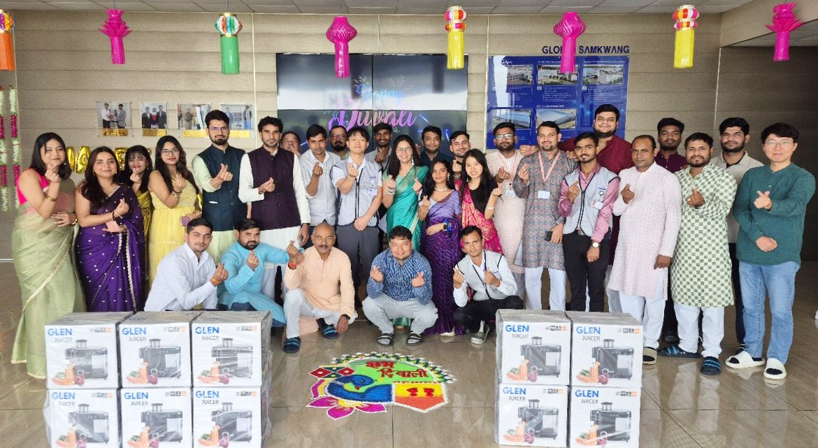 [October 20-22, 2025] Samkwang Co., Ltd.‘s India Division celebrated the 'Deepavali’ festival by presenting juice extractors to all employees, sharing a warm moment together. One of India's largest festivals, Diwali is the ‘Festival of Lights,’ a day to dispel darkness and celebrate new beginnings. In India, Diwali is not merely a holiday but is regarded as a time for **‘balance and prosperity in life’**. During this period, people clean their homes and workplaces, light lamps, and pray for good fortune and abundance. In line with this, employees of Samkwang's India Business Division decorated their office spaces with lanterns and floral arrangements, shared gifts prepared by the company, and celebrated the holiday's meaning together. An employee who received a gift shared, “It was wonderful that the company respects our culture and allowed us to celebrate together. Decorating both inside and outside the office, laughing, chatting, and taking commemorative photos made it an even more enjoyable and meaningful day.” Samkwang plans to continue respecting local cultures and steadily expand its welfare programs so all members can share in happiness.