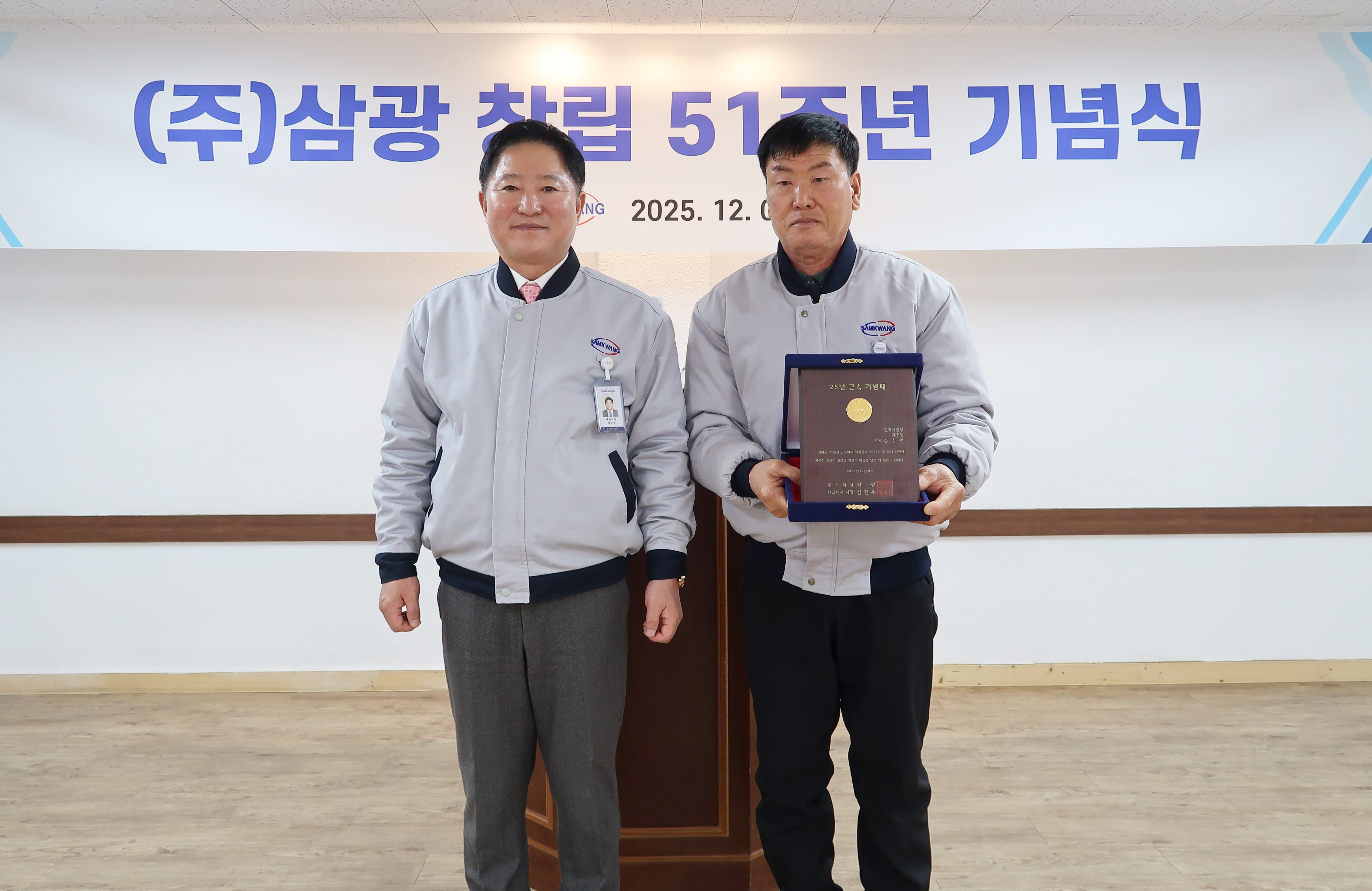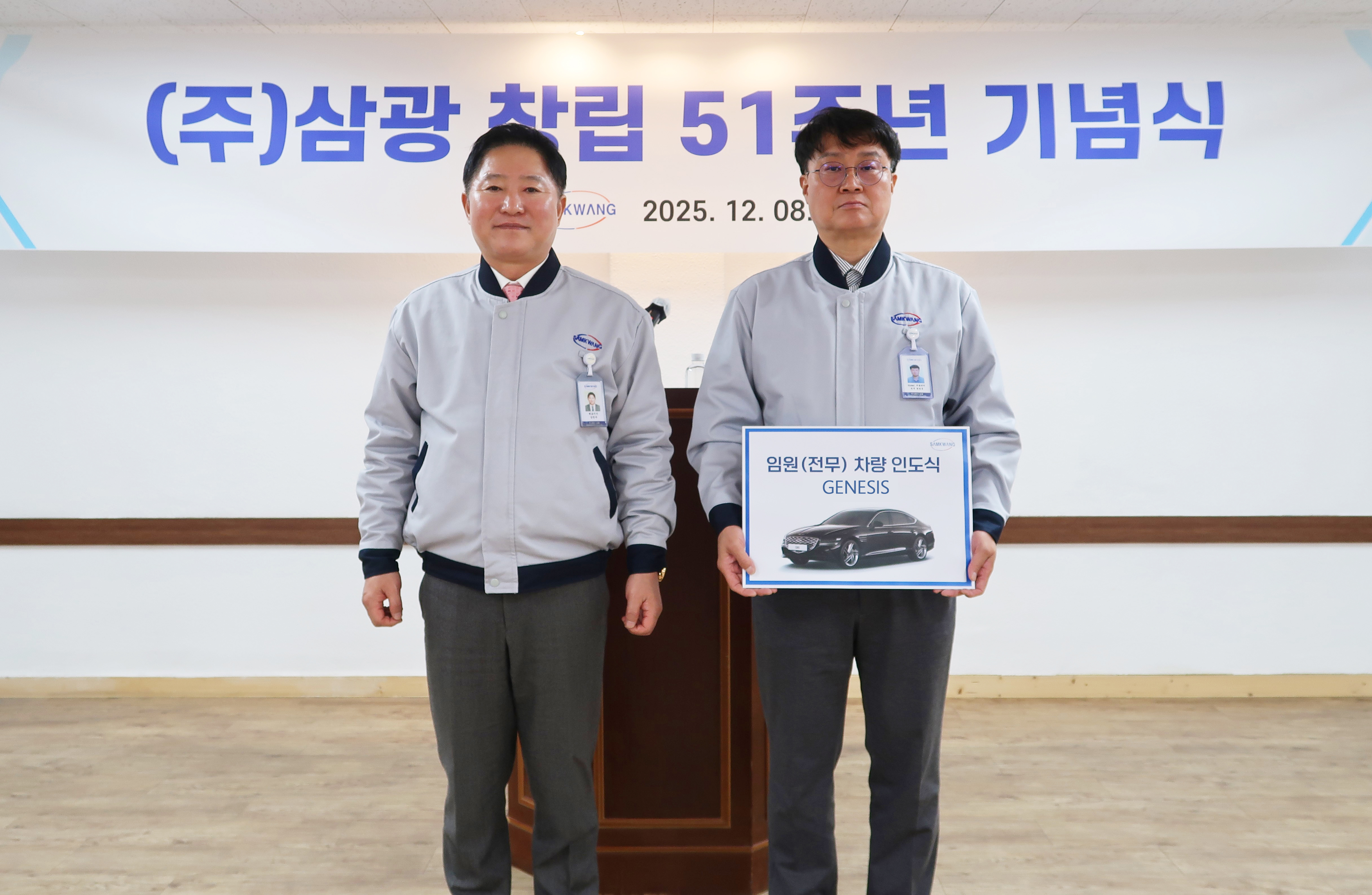 On Monday, December 8, 2025, the December monthly meeting and 51st anniversary founding ceremony were held, with 29 outstanding employees from the Overseas Business Division (Vietnam, India) in attendance. At the appointment ceremony, Executive Vice President Jinyoung Choi of the Global New Business Division was appointed as Director of the Technology Research Institute. For the Long-Service Awards, a total of 23 employees were honored for their consistent dedication and sense of mission, contributing significantly to the company's development. Awards included: 9 employees with 10 years of service (domestic/international) received 2.5 taels of pure gold (worth 2 million won), 7 employees with 15 years received 3 taels (worth 2.5 million won), 6 employees with 20 years received 3.7 taels (worth 3 million won), and one employee with 25 years of service received 4.4 taels of pure gold (worth 3.5 million won). November's Outstanding Employees were selected as: Seungji Kang, a Pro from the Global Development Center, who contributed to cost savings through process improvements via product structure changes; and Hwayong Oh, a Pro from the Vietnam Business Division Manufacturing Team (Molds), who contributed to cost savings by reducing defect rates through mold structure improvements. At the executive vehicle delivery ceremony, a vehicle was presented to Executive Vice President Yeongjun Jeong of the Global Development Center. The ceremony conveyed the shared message of growth motivation through effort and achievement to all employees. At the mentor-mentee pairing ceremony, a total of six mentees received business card cases and smile badges. Following this, to mark the founding anniversary, attendees watched congratulatory messages from employees celebrating the 51st anniversary and a video chronicling Samkwang's journey into the U.S. market. CEO Jinwoo Kim stated, "Many of you were honored at today's long-service awards ceremony. I sincerely hope even more long-service employees will be recognized next year. Fifty years is by no means a short time. Though we faced many twists and turns during that long period, I believe we were able to reach this 51st anniversary today because we overcame all those challenges together. I sincerely thank you for your hard work. Last December, at the Fukuoka, Japan workshop and 50th anniversary ceremony, we made a declaration. Based on the three proclamations: AWAKE, SEE, OVER THE ANOTHER WORLD, we resolved to move forward targeting AI, Aerospace (Drones), Materials Industry, and Silver Industry. Particularly in the Aerospace (Drones) field, there aren't many places domestically that manufacture drone components. It's a challenging and meaningful endeavor, one that Samkwang is currently the only company truly tackling. The same applies to the AI sector. We are advancing development in consultation with global leader NVIDIA. The materials industry is also a challenging field that can easily become financially burdensome. The silver industry is likewise an area we must prepare for amid the rapidly advancing trend of an aging society. It has been one year since this declaration was announced. I believe now is the time to reflect on how much we have changed over the past year. Ultimately, the most crucial element in driving all this forward is people. If any employee feels they have areas needing improvement, I encourage self-development. The company will fully support your growth. Each and every one of you is an asset and a hope for the company, the main actors who will pioneer the path ahead. There is a saying: “One talented person can save a company.” And the power that ultimately supports that talent is perseverance. Only with perseverance can individuals grow and companies develop. Everyone, please never lose your perseverance. While 100% satisfaction may be unattainable, we must strive toward 100%. The company will provide maximum support for you to achieve results, and when you do, we will repay you with even better support. Let's run together toward 100%. This year is nearly over. Please take good care of your health, and I hope to see you all again with bright smiles. You've all worked incredibly hard to reach our 51st anniversary. Thank you."