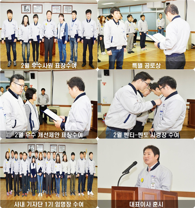 2월 우수사원 표창은 본사 조달영업팀 정승태대리외 7명에게 수여되었으며, 특별 공로상은 2공장 제조팀 장종환사원이, 2월 우수 개선제안 표창은 2공장 김동희사원외 2명이, 2월 멘티-멘토 사령장은 경영관리팀 정성훈 주임외 1명에게 수여되었으며, 사내 기자단 1기 사령장은 3공장 도장팀 조길호 대리외 23명에게 각각 수여되었습니다.