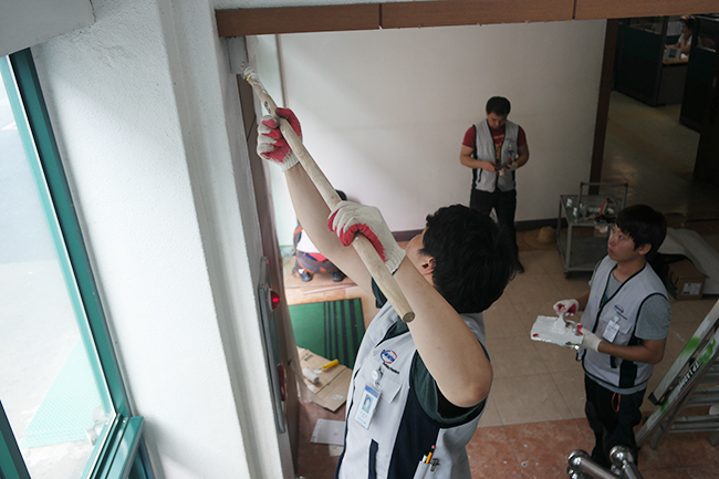 공무팀 노경석대리는 내부 벽면 도색공사를 위한 사전 공사 가이드라인을 설치하고 직원들의 이동경로를 확보 하는 등 사전 공사 준비에 만전을 기하고 있었으며, 천팀장을 중심으로 각자 맡은 구역에서 안전하게 도색공사를 마무리 하였습니다.