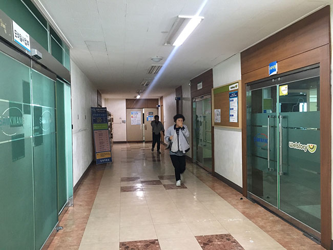<화재 경보 후 건물 밖으로 신속하게 대피하는 직원들의 모습>