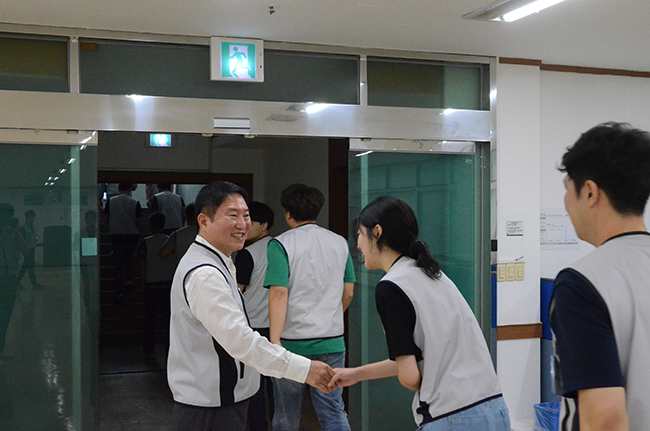 <직원들과 악수하며 격려하는 대표이사의 모습>