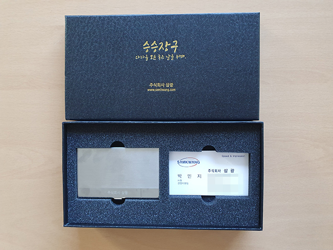신입사원들에게 명함 전달식을 진행함으로 삼광의 정식 일원 됨을 인정해 주는 의미 부여를 하라는 대표이사의 깊은 뜻을 전달하며, 면수습을 하는 신입사원들에게 동기부여를 하였고, 모바일사업부 개발팀장도 함께 참여하여 담소를 나누었습니다. “승승장구라는 문구가 새겨진 특별히 제작된 명함과 명함 케이스를 전달하자, 신입사원들은 기쁨과 동시에 무거운 책임감이 든다는 소감을 밝혔으며, 기념촬영 후 행사를 마무리 하였습니다.