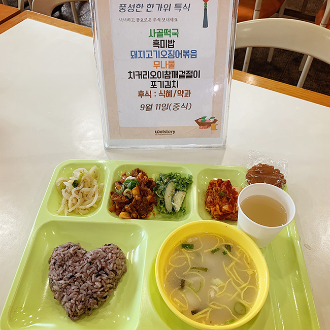 한편 금일 본사 식당에서는 삼광 임직원들 모두 풍성한 한가위가 되었으면 하는 의미로 점심 특식을 준비하였습니다. 추석 특식으로 사골떡국을 메뉴로 준비하고, 돼지고기 오징어 볶음, 무나물, 치커리 오이 참깨 겉절이 등 다채로운 식단과 후식으로 약과, 식혜도 준비하여 풍성한 식단으로 임직원들에게 제공하였습니다. 회사에서 준비한 특식에 임직원들은 동료 직원들과 웃음꽃을 피우며 즐거운 식사 시간을 가졌습니다.