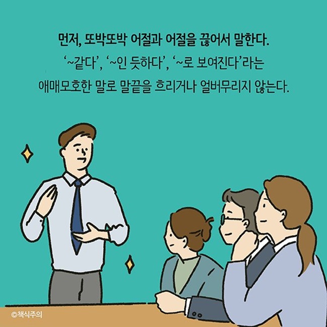 또한, 두 번째 방법 신뢰 가는 사람의 말투는 어절을 또박또박 말하며 상사로부터 신뢰를 얻고, 극단적인  표현을 과장하지 않고 과한 주장하지 않음으로써 다른 사람들 이 의견을 낼 수 있는 환경을 만들어주는 상사가 될 수 있습니다.