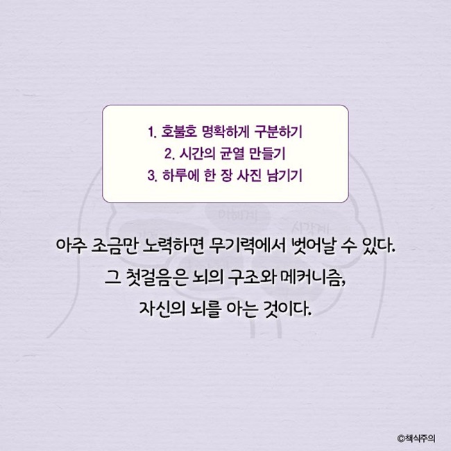 지루한 일상에 아침 스트레칭과 같은 활동으로 짧게는 5분 길게는 30분까지 작더라도 조금의 변화를 주고, 회사에서는 같은 일을 하더라도 시작과 끝 시간을 정하여 목표 지향적으로 움직인다면 뇌의 작용을 활발하게 만들어 주어 보다 삶이 보람차게 느껴져 무기력을 이겨낼 수 있을 것입니다.