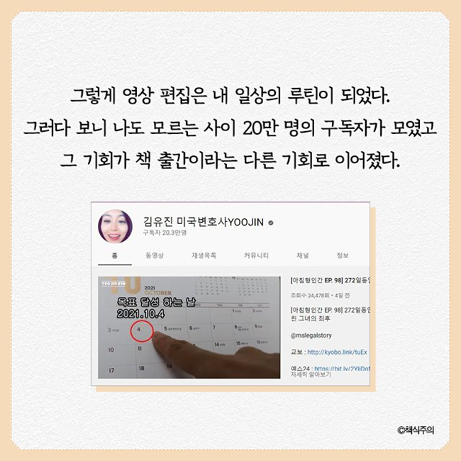 틈틈이 나는 시간에 영상 편집이라는 새로운 루틴을 만들어 실천한 칼럼의 주인공처럼 잠깐의 자기계발이 자신을 유튜브 20만 구독자, 출간인으로 만들어 주어 내 인생에 새로운 길을 열어주기도 하기 때문입니다.