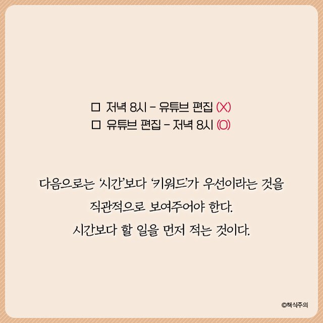 여기서 특히 주의할 점은 시간에 따라 할 일을 적는 것이 아닌, 내가 중요시 여기는 가치를 중심으로 핵심 키워드를 적는 것입니다.