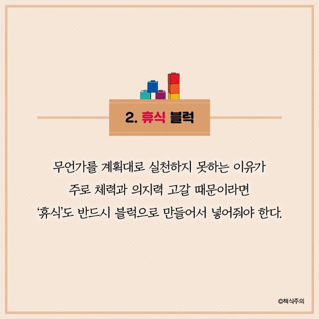 아파도 힘들어도 반드시 사수 하고 싶은 단 하나의 코어 블록을 만들어 목표 달성을 할 수 있는 구심점을 심어주고, 에너지를 크게 소진하는 일 다음 휴식 블록을 배치하여 고갈된 의지력과 체력을 보충해 주어 꾸준히 실천할 수 있도록 해야합니다.
