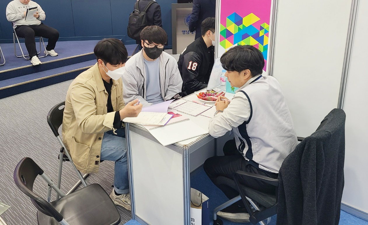 영남대학교 취업박람회는 경산 지역 5개 대학 제1회 취업박람회로 지역 인재 총 22개 기업이 참여하였으며, 삼광 부스를 운영하며 약 50여 명의 학생들과 삼광 홍보 및 면담을 진행하였습니다.