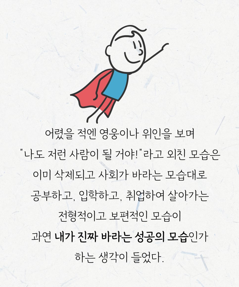 우린 어렸을 적 영웅이나 위인들을 보며 ‘나도 저런 사람이 될 거야!’라고 생각하며 크지만, 점점 사회가 바라는 모습대로 공부하고, 입학하고, 취업하며 살아가는 전형적이고 보편적인 사람이 됩니다.