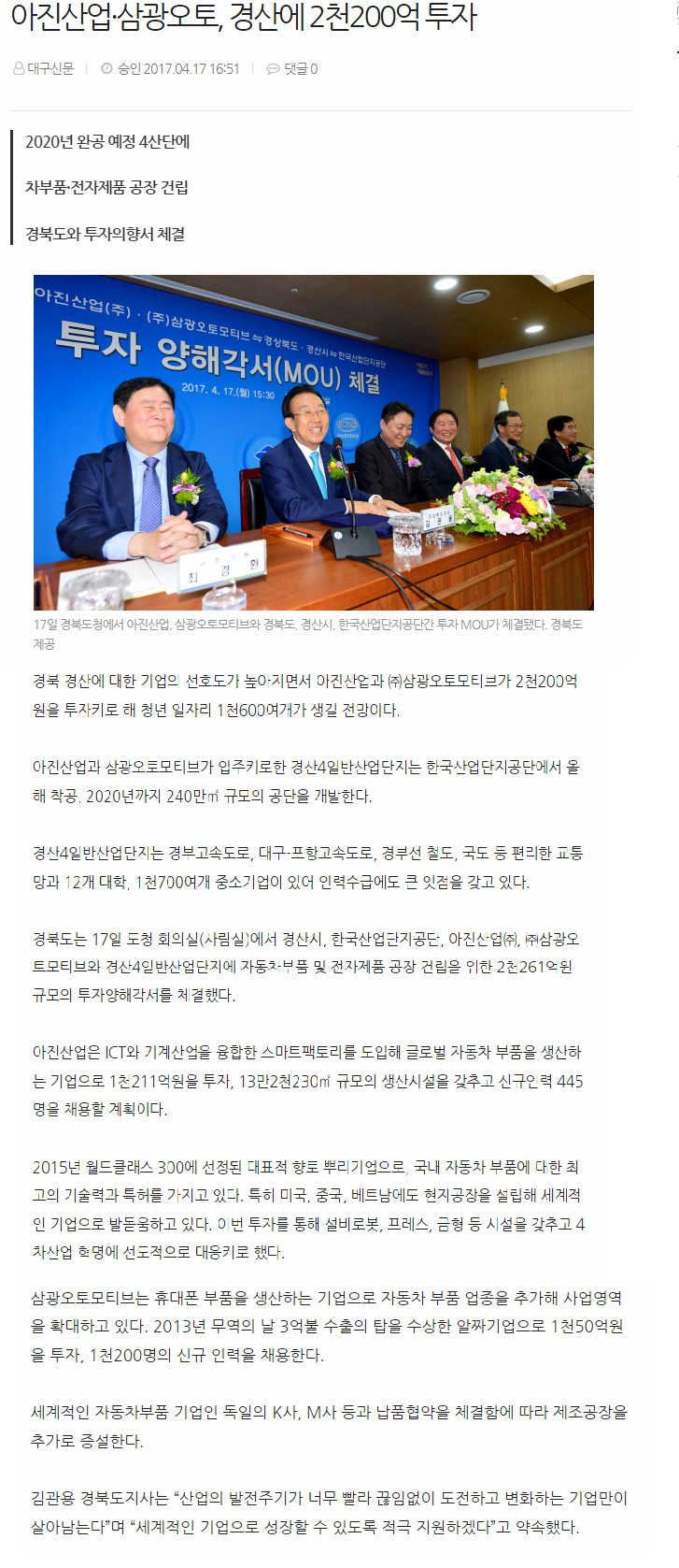 | 삼광오토모티브, 경산에 2천억대 투자 협약 (2017년 4월) Author관리자 Date2018.01.18 Hit4040 |